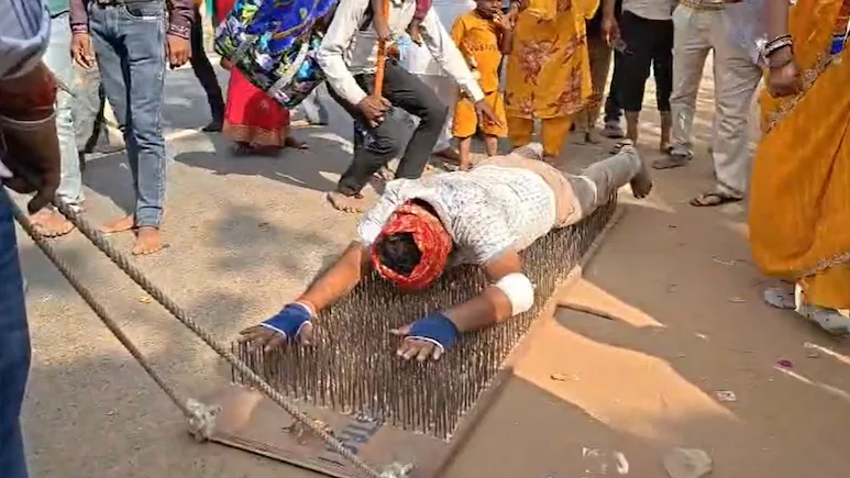 सोनू पिछले चार दिनों से 2100 लोहे की कीलों पर पेट पलायन कर रहे हैं. हर कील लगभग 5 इंच लंबी है और इनका कुल वजन करीब 26 किलोग्राम बताया जा रहा है. इन्हीं नुकीली कीलों पर लेटकर वह धीरे धीरे आगे बढ़ते हुए लगभग 17 किलोमीटर की दूरी तय कर रहे हैं. यह साधना शारीरिक रूप से बेहद कठिन मानी जाती है लेकिन उनकी आस्था उन्हें निरंतर आगे बढ़ा रही है.