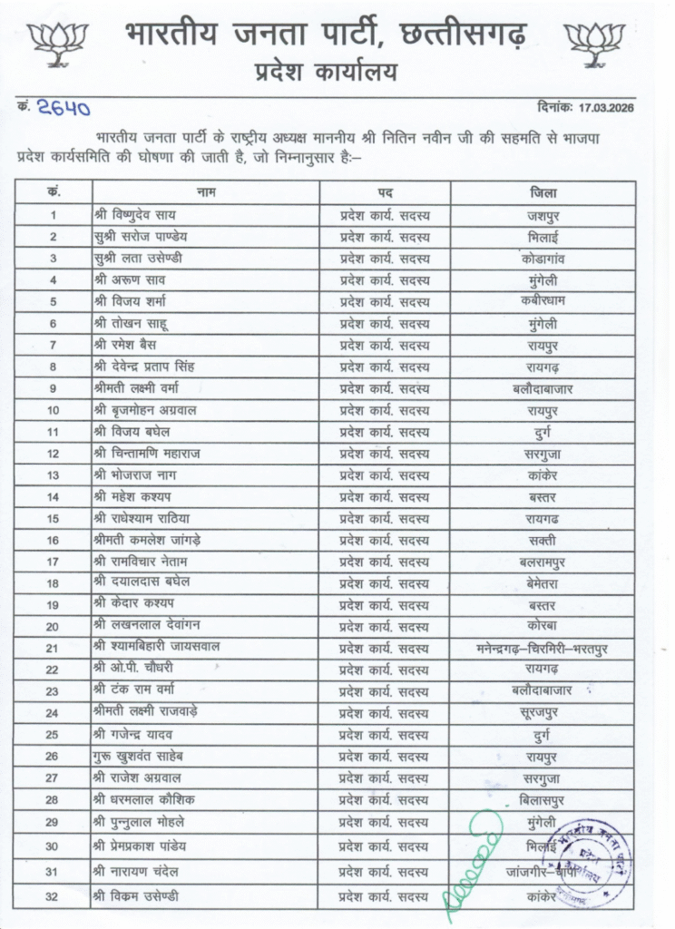 छत्तीसगढ़ बीजेपी ने प्रदेश कार्यसमिति घोषित कर दी है. भारतीय जनता पार्टी के राष्ट्रीय अध्यक्ष नितिन नबीन की सहमति के बाद 84 सदस्यों की सूची जारी कर दी गई है. इस सूची में सीएम विष्णुदेव साय, डिप्टी सीएम और मंत्रियों समेत कई नेताओं को जिम्मेदारी सौंपी गई है. इसके साथ ही प्रदेश स्थायी आमंत्रित सदस्य और प्रदेश विशेष आमंत्रित सदस्य की लिस्ट जारी की है.