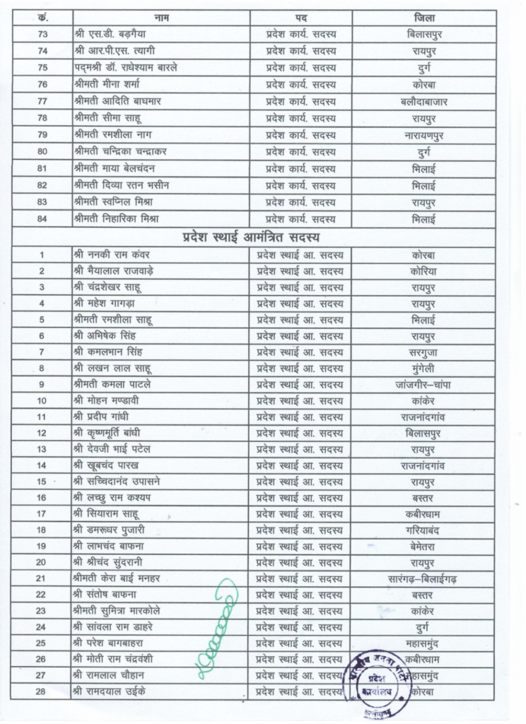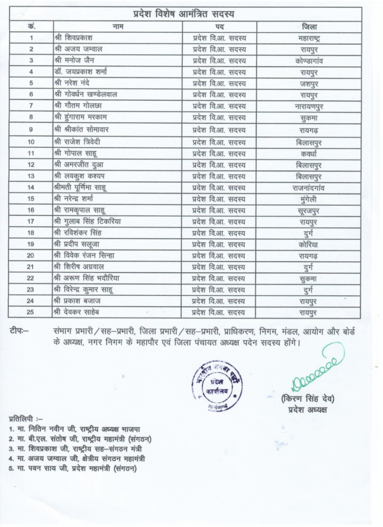 कार्यसमिति के साथ-साथ प्रदेश स्थायी आमंत्रित सदस्यों की सूची भी जारी की गई है. इसमें 69 सदस्यों का नाम है. वहीं प्रदेश विशेष आमंत्रित सदस्य लिस्ट घोषित की गई, जिसमें 25 सदस्यों को नाम है. शिवप्रकाश और अजय जामवाल जैसे बड़े नेताओं को इस सूची में शामिल किया गया है.