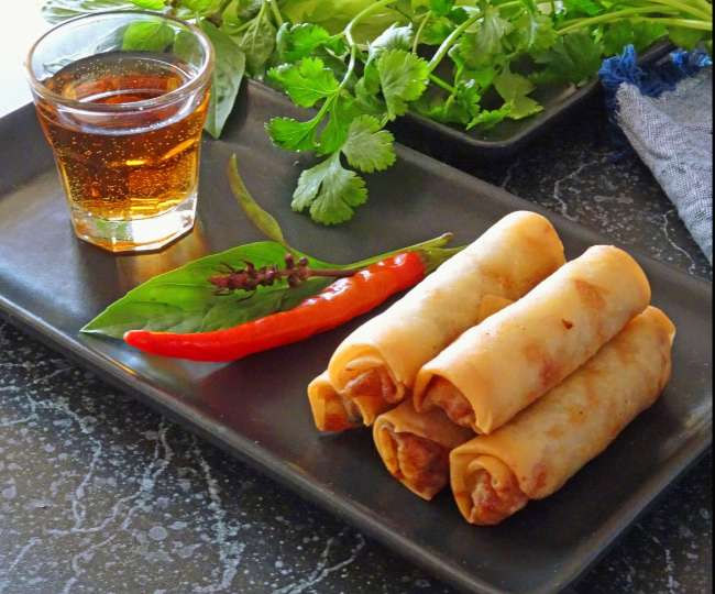 पानी डालते हुये गूंथ लें. फ्राई पैन में 1 छोटा चम्मच तेल डालें, गरम होने पर अदरक पेस्ट, हरी मिर्च डाल कर हल्का सा चलाएं, फिर मटर के दाने डालकर 2 मिनट ढककर पका लें. इसके बाद शिमला मिर्च और पत्ता गोभी डालकर एक मिनट भून लें. इसके बाद पनीर, काली मिर्च, नूडल, सोया सॉस, नींबू का रस, हरा धनिया और नमक डालें और अच्छी तरह से पका लें. अब आपकी स्टफिंग तैयार है. मैदा से 13-14 लोई बना कर सूखे मैदा में लपेटे और पतला बेल लें. फिर एक पूरी के ऊपर अच्छी तरह से तेल लगाएं और उसके ऊपर दूसरी पूरी रख कर इसे बेलते हुए इसे बेलते हुए 9-10 इंच के साइज का बना लें. इसी तरह बेलकर कर लें. अब फाई पैन में थोड़ा सा तेल डाल कर गरम करें. फिर दोनों पुरियों को उलट-पुलट कर हल्का-हल्का सेंक लें. सिंकने के बाद आपके रैपर तैयार हैं. अब 1 बड़ा चम्मच मैदा का गाढ़ा घोल बना लें, जिससे रैपर के किनारों को चिपकाया जा सके. इसके बाद एक रैपर को फैलाकर उसपर 2 चम्मच स्टफिंग रखें और उसे थोड़ा-थोड़ा किनारा छोडते हुए फैला लें. रैपर का ऊपरी सिरा मोड़ लें. इसके बाद किनारों पर मैदा का थोड़ा- थोड़ा घोल लगा कर अंदर की ओर मोड़ लें और रैपर को ऊपर से रोल करते जाएं. रैपर के आखिरी छोर पर थोड़ा सा मैदा का घोल लगाएं और चिपका लें. फाई पैन पर 2 बड़े चम्मच तेल डाल कर गरम करें. फिर उस पर जितने रोल आ सके उतने रखें और उलट-पलट कर गोल्डेन ब्राउन होने तक सेक लें. आपके स्प्रिंग रोल तैयार हैं.